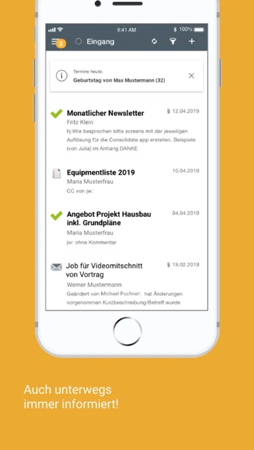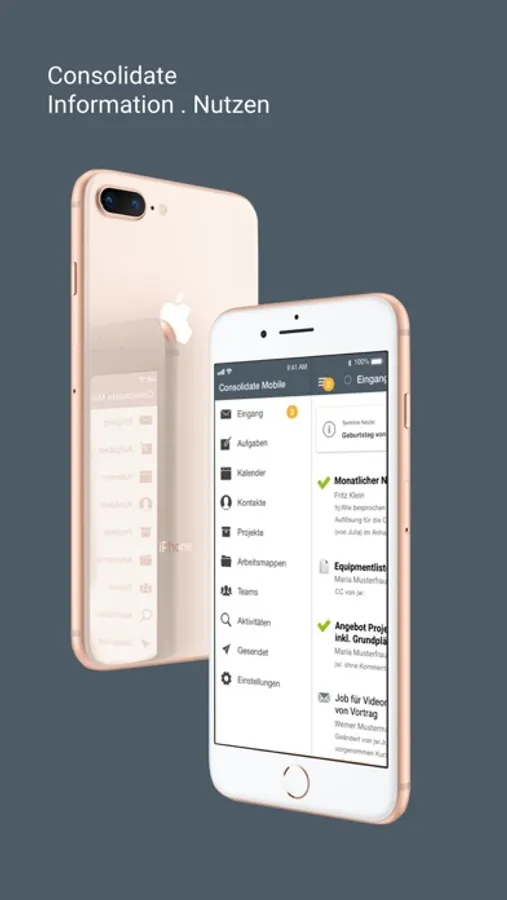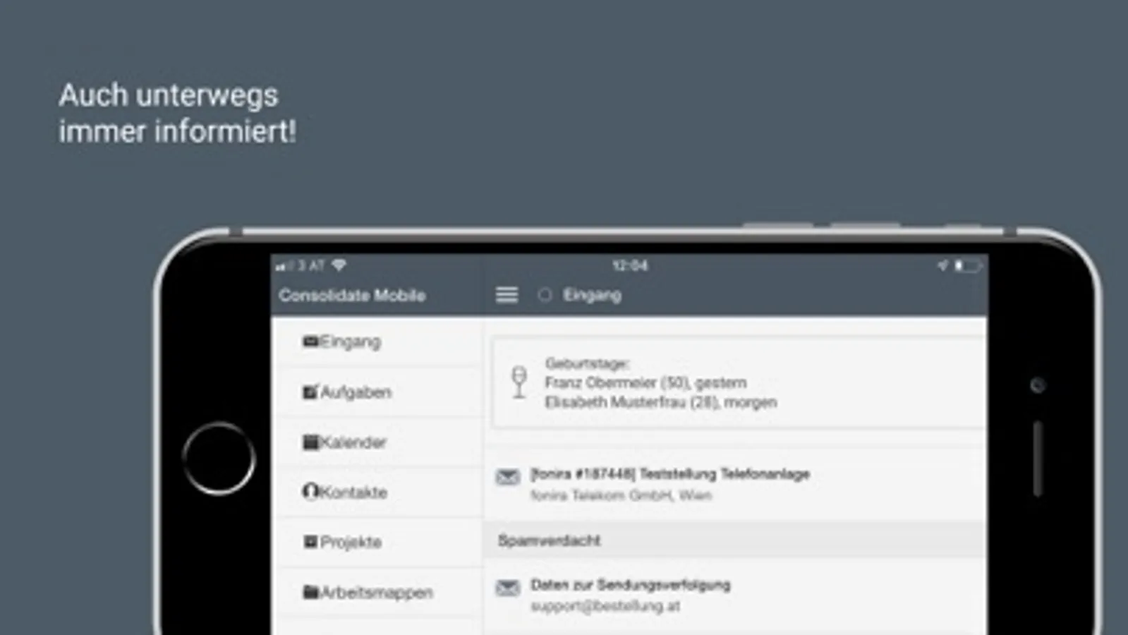 Mit der Consolidate App nehmen Sie die Vorteile Ihrer Consolidate-Lösung auf dem iPhone oder iPad mit auf Reisen. Mobiles Arbeiten bekommt damit eine neue Dimension. Alle nötigen Informationen stehen zu Ihrer Verfügung und das auch ohne ständige Internet-Verbindung. Ein integrierter Mechanismuss gleicht Ihre Änderungen vollautomatisch mit dem Server ab und signalisiert neue Nachrichten als Push-Mails.