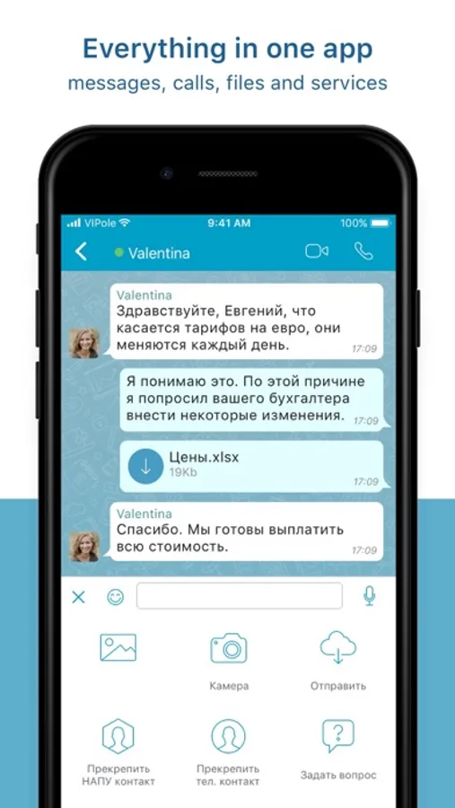Send any file type, view photos and documents that you get in VIPole and share them with other contacts and group chats. Access the gallery and the camera directly from chats to choose the pics on the device or take photos.