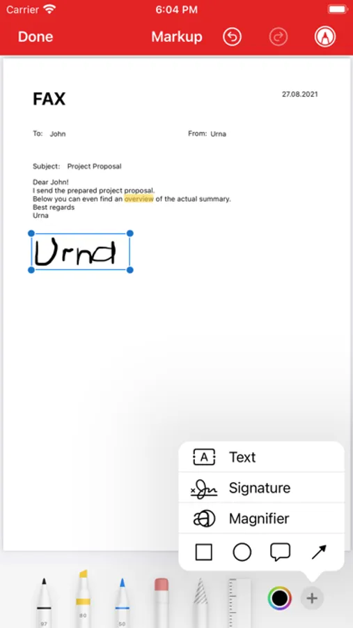 You can add your signature, drawings, symbols and arrows, text, magnifying glass function and markers to the document directly in the app.