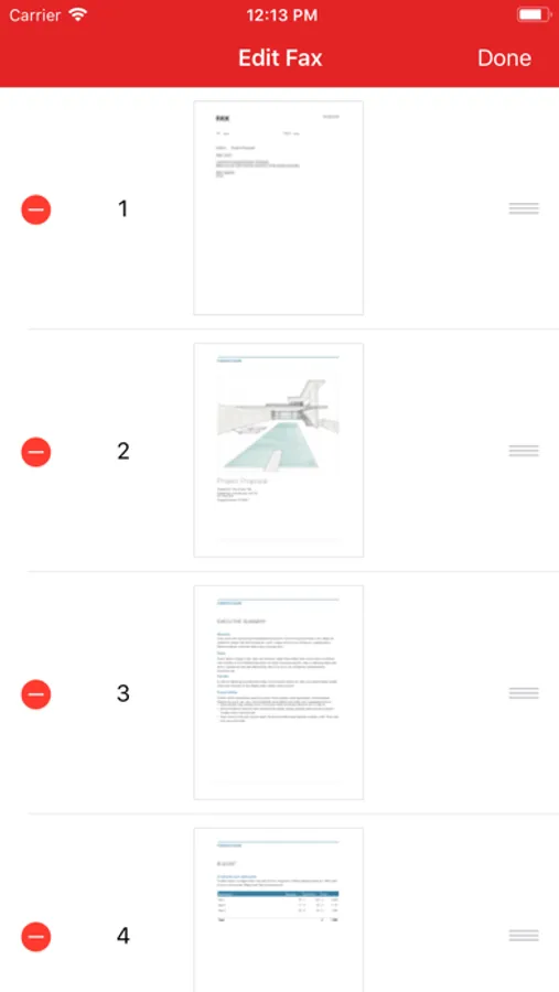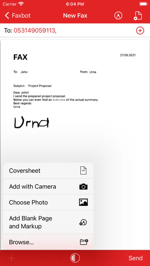 You can pass a PDF file from another app via share menu directly to Faxbot. With the documents menu, you have the opportunity to access documents from iCloud Drive or other apps like Dropbox, ownCloud, Documents, etc.. You can attach any number of documents to a fax and delete pages from a PDF. Password protected PDF files and markups are supported.