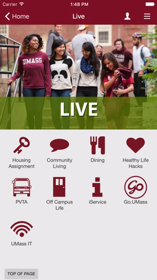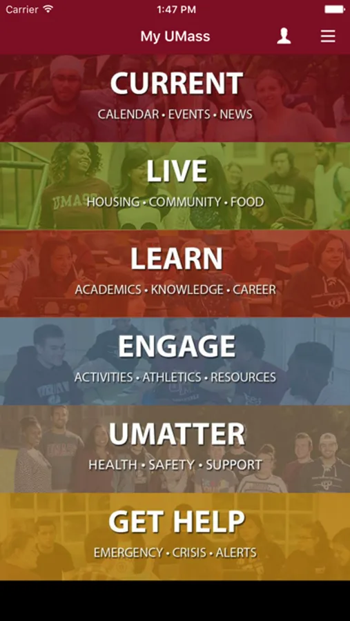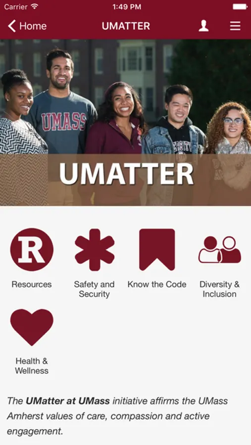 My UMass, formerly Living at UMass, provides the University of Massachusetts Amherst community mobile access to campus events, calendars and notifications. Important information and deadlines from a variety of programs and resources are available at your fingertips. Enjoy student experience videos and social media feeds for a virtual look into student life at UMass. Explore ways to connect with your community, engage with your peers, build relationships, succeed academically, and utilize the many resources available to you at UMass.