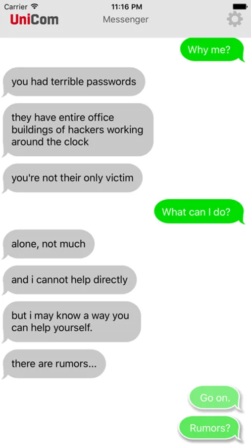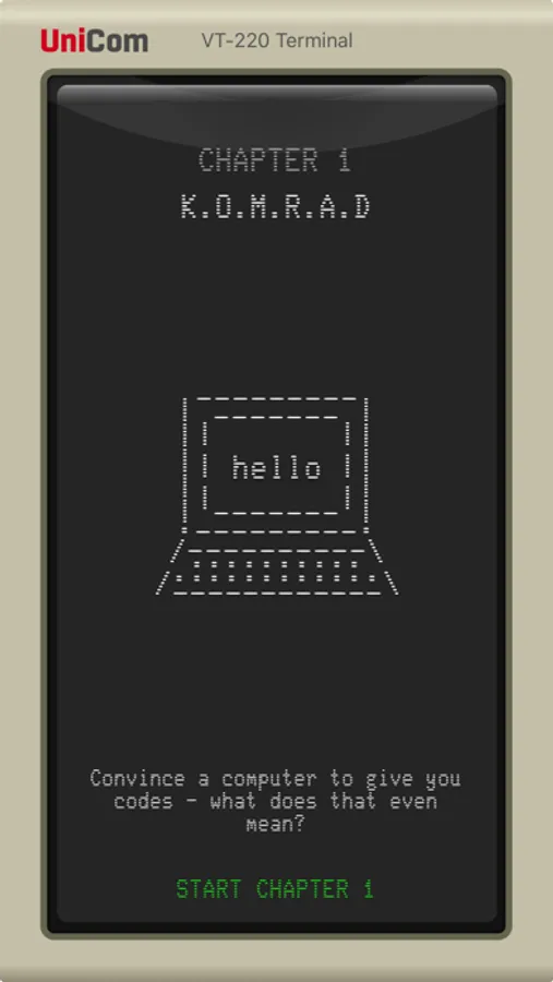 Chat with an A.I. - this interactive adventure game gives you a chance to chat with a Soviet Artificial Intelligence from 1985 that’s been training in the dark for thirty years, doesn’t know the Cold War ended, and may be connected to the world’s second largest nuclear arsenal. KOMRAD is a casual interactive story game for iOS 9 and 10 and watchOS 2 and 3 that plays out through conversations and choices.