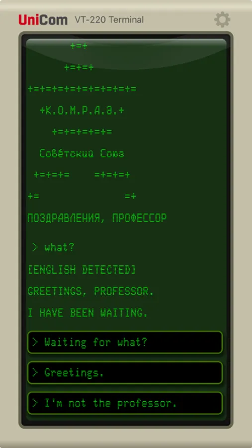 When the Soviets shut down a secret project in 1985, they forgot one thing—to turn off the computer. Now you are the first person to connect to this advanced artificial intelligence that has been training in the dark for thirty years, unaware the Cold War has ended. Your conversational choices will determine your fate--and the fate of the world.