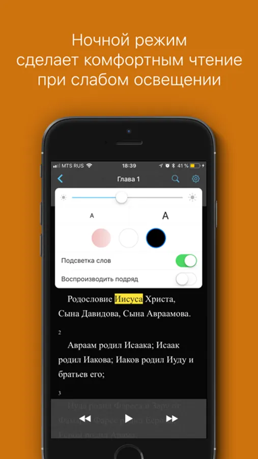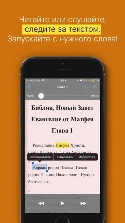 ・Воспроизведение с выбранного слова при помощи долгого касания;