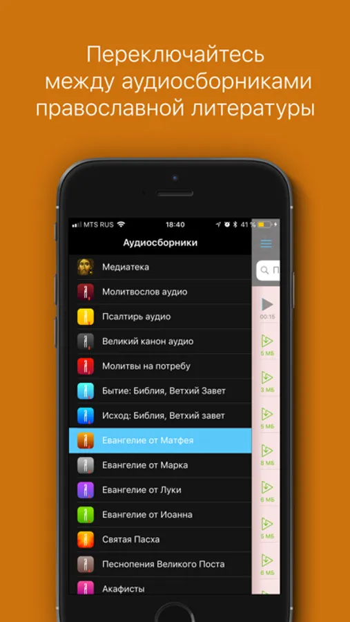 ・Легкое переключение между православными тематическими аудиосборниками через выпадающее меню;