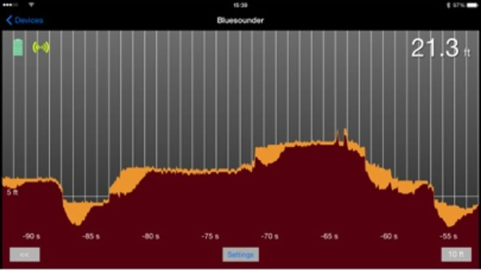 Bluesounder is a Bluetooth ® BLE linked echo sounder designed specifically for baitboats used in the sport of coarse fishing. Baitboats ordinarily take baits and line to distant locations with the help of remote echo sounders to locate optimum locations. Existing echo sounders for baitboats rely on conventional monochrome LCD displays to provide visual depiction of the bed of fishing waters. Bluesounder interprets the existing radio transmissions from these baitboats and passes them to an iPhone or iPad to display a much more detailed image with choice of colour schemes. The display can be frozen, swiped back in time so that the last few minutes of depth profile can be reviewed and the units and zoom levels can all be changed to suit the user and conditions. A radio transmission strength (from the baitboat) indicator and Bluesounder battery condition meter are present to provide all the information you need to survey your venue and find that perfect spot.