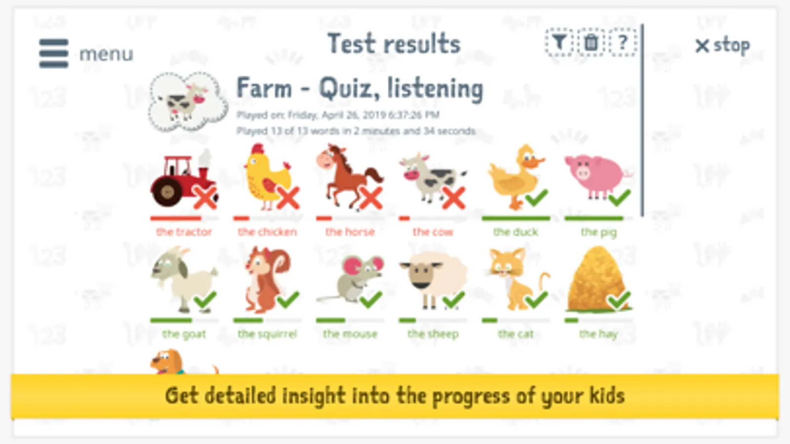 Listening and reading skills of children are measured by the app, and can be viewed by parents and supervisors. The results can be viewed for a limited time only. An in-app purchase allows you to view the results of the last two weeks, and allows filtering by category and skill.
