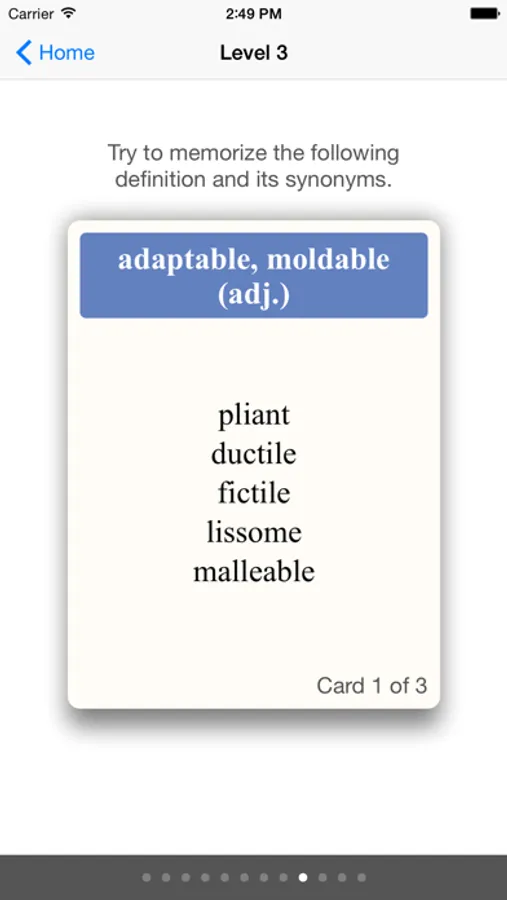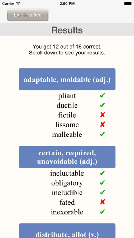 These tough words are guaranteed to challenge you! Our unique learning technique is a MUCH more effective way to study than ordinary flashcards and alphabetized word lists. Impress your friends with your thesaurus like knowledge as your vocab grows.