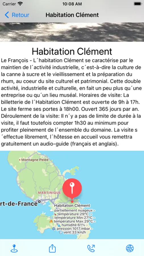 Un condensé du patrimoine de la Martinique, dans votre iPhone, Apple Watch et iPad. Pour chaque endroit à visiter une description. Un itinéraire précis à partir de votre position (GPS activé) ou de votre commune de départ.