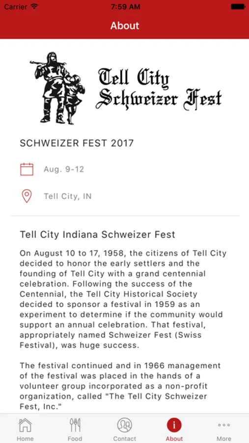 This is the official app for the Tell City Indiana Schweizer Fest (August 10-13, 2022). Schweizer Fest has become a well-known, community-wide celebration, offering free entertainment and activities for people of all ages. It is now one of Indiana's longest running community festivals. The cooperative efforts of many civic groups, clubs, organizations, and businesses make Schweizer Fest the grand success it is.