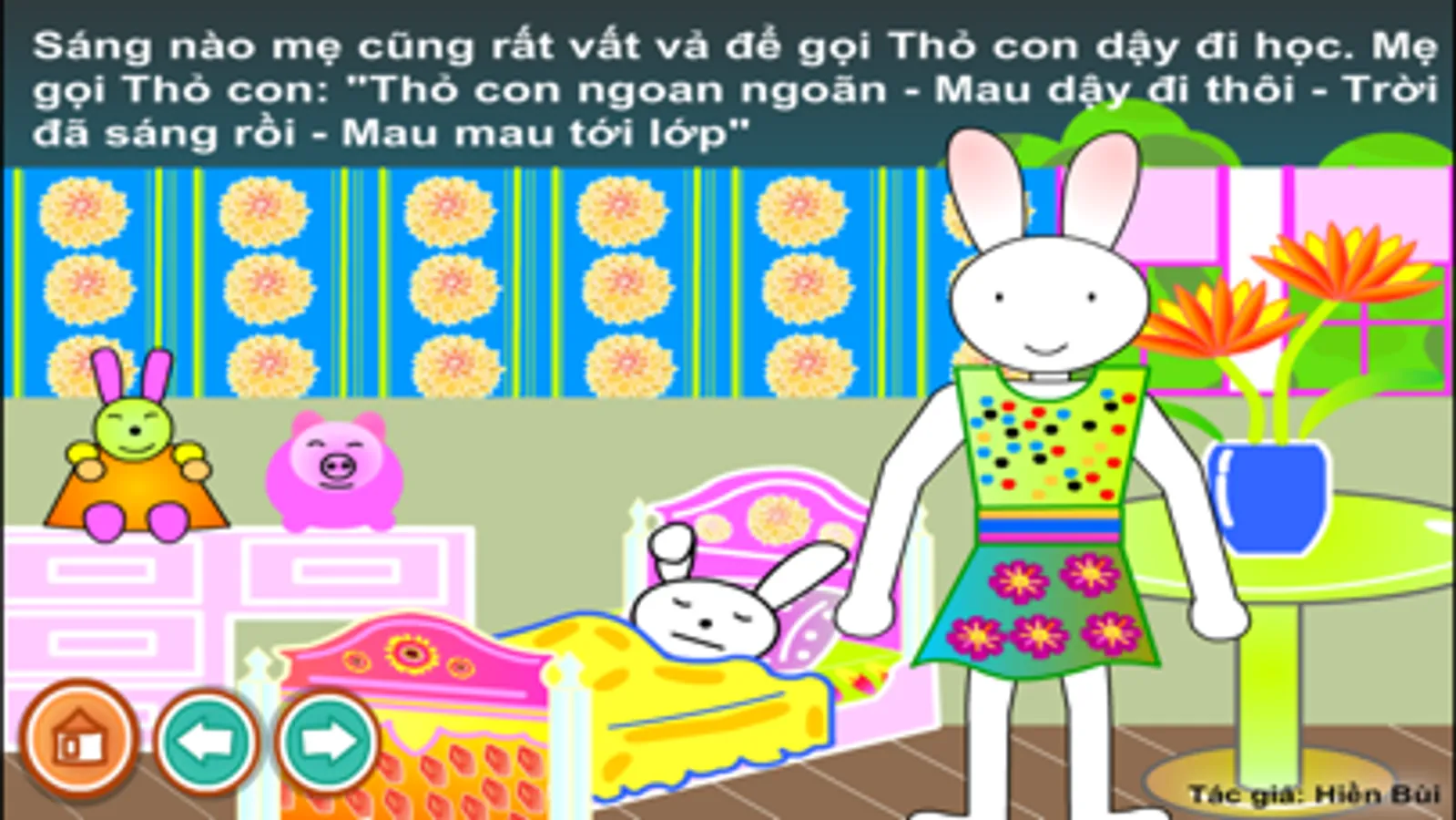 Thỏ con hàng ngày hay thức khuya để xem TV nên sáng ra dậy rất muộn. Thỏ mẹ đánh thức thỏ con dậy để đi học rất vất vả.