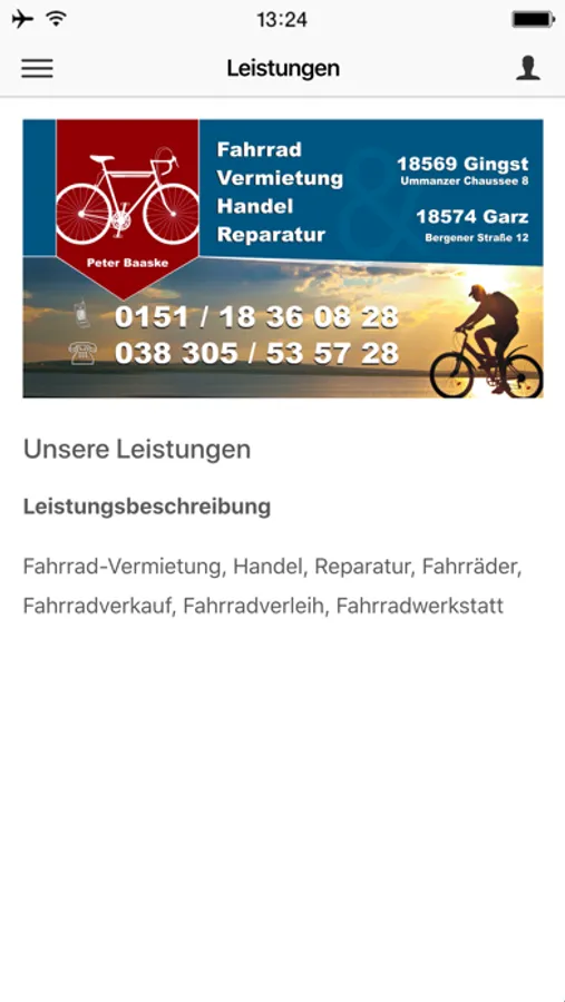 Holen Sie sich unsere offizielle Fahrrad-Vermietung P. Baaske-App! Informieren Sie sich mobil über unser Unternehmen und stehen Sie immer in direktem Kontakt zu uns. Sie sind mobil - und wir sind es ab sofort für Sie auch!