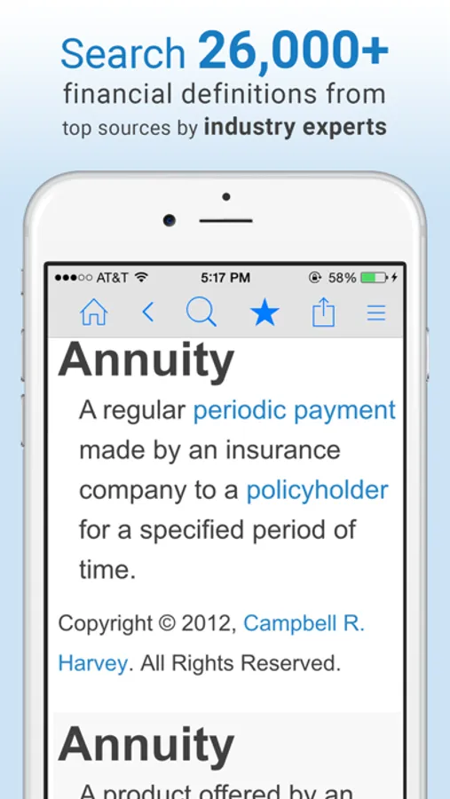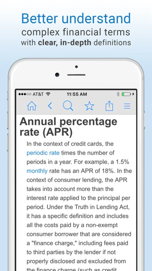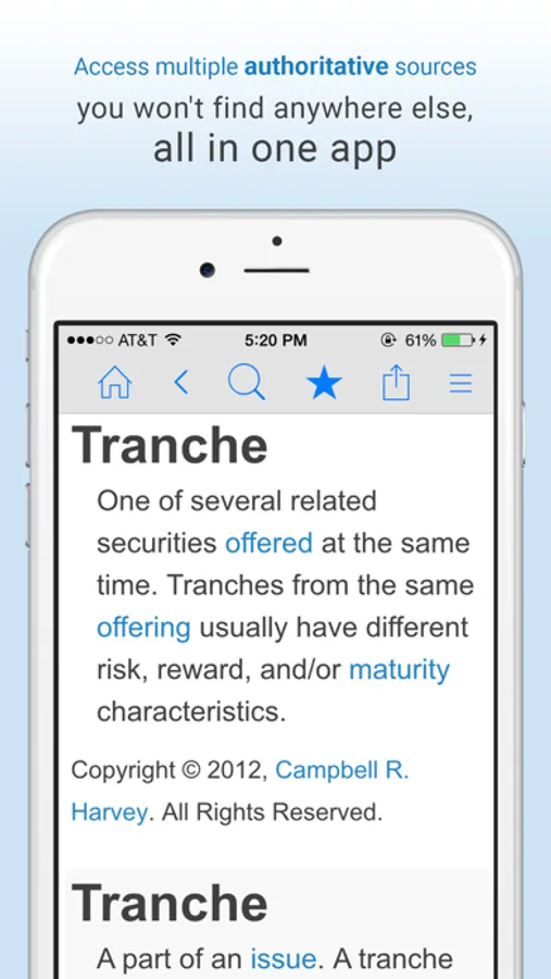 Whether you're a financial advisor, an investor, a business student, or just curious about the world of finance, this free financial dictionary app will help you find clear, in-depth definitions of business terminology right on your iPhone or iPad. Search across multiple disciplines for detailed entries on: