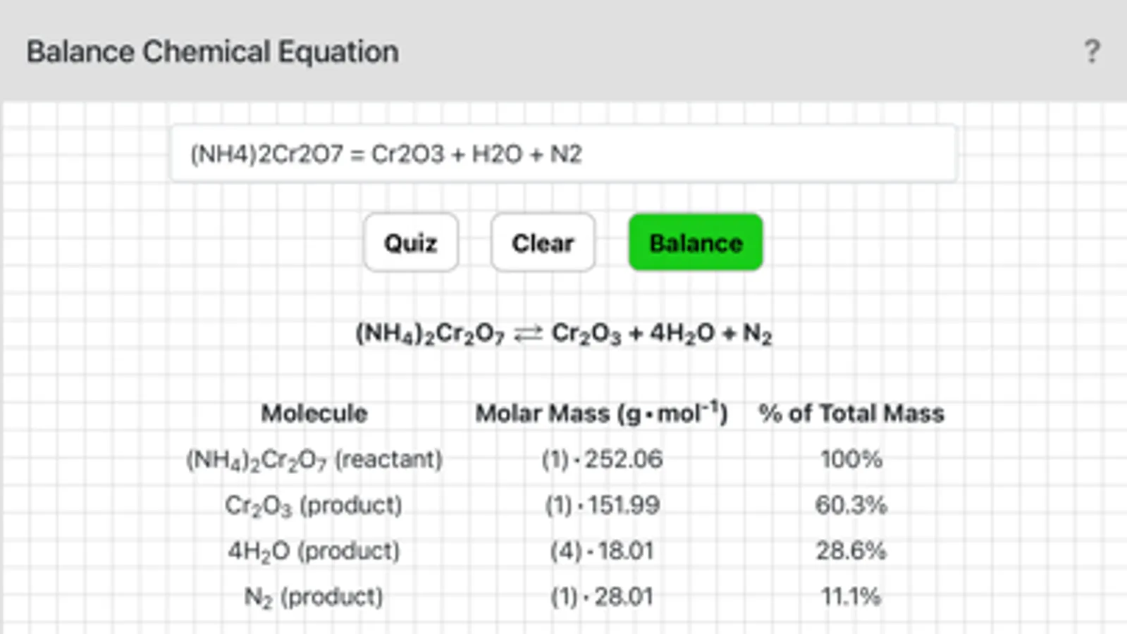 To use this App enter an equation and tap Balance. Separate reactants and products with =. The Quiz feature lets you practice balancing equations by hand. Tap Quiz to display an unbalanced chemical equation. Work out your answer, then check the result.