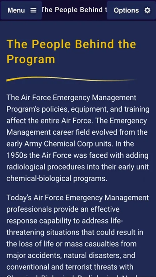 This digital version of the Air Force EM Program Senior Leader Guide is intended to familiarize and assist Air Force senior leaders with implementing the Air Force EM program at the installation level. This guide identifies how members of the installation and the Civil Engineer Squadron’s Readiness and Emergency Management Flight support the Air Force EM program across all levels of the installation.