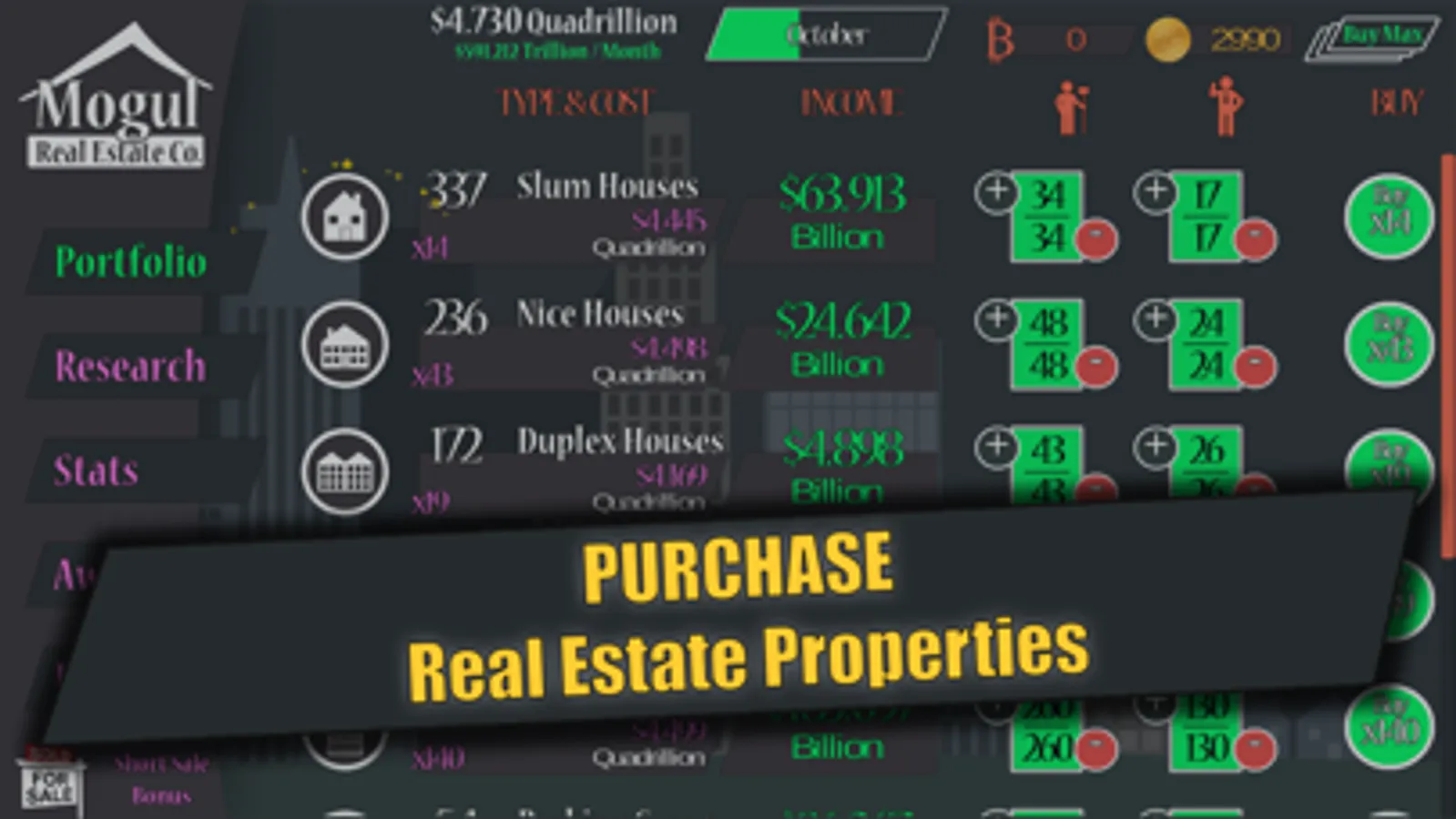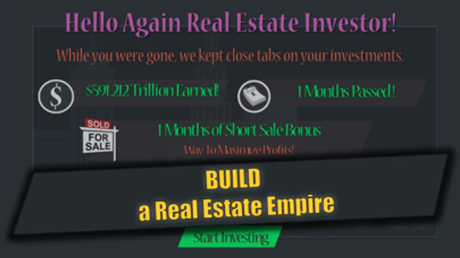 Start small, buying a few Slum Houses, wait a little while, and reinvest to buy better and better properties. After a while, retire to gain Brokers and use them for Huge Permanent Research Bonuses. Can you climb to the top and become the Real Estate Mogul?