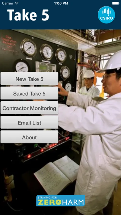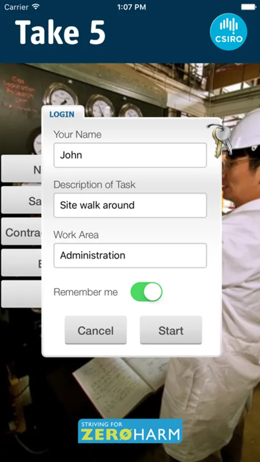 1) Choose ‘Begin’ to start Take 5 process; fill in your full name, description of task and locations of task and push ‘Start’
