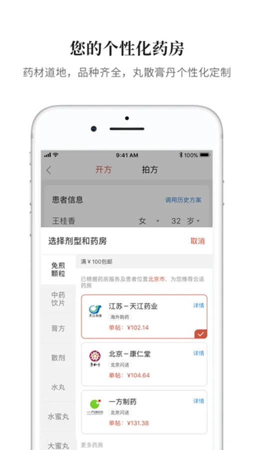 —添加患者、患者线上极速问诊开方、精选道地中药调剂后直接闪送送药到家,线上看病一站式完成