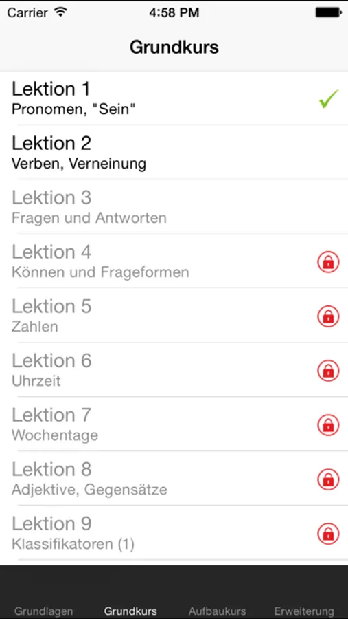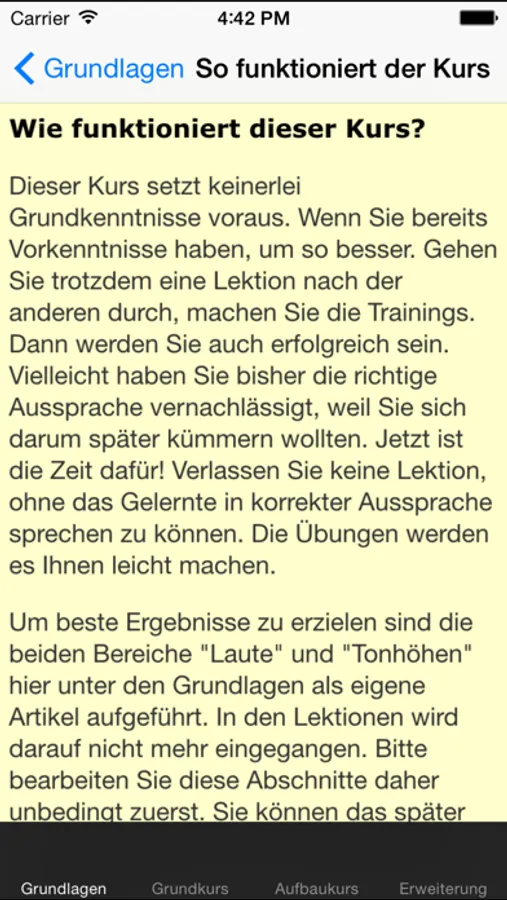 Die App, wie Sie sie hier herunterladen können, hat drei freigeschaltete Lektionen des Grundkurses. Die zweite und die dritte Lektion lassen sich jedoch erst öffnen, wenn die jeweils davorliegende Lektion gelernt und in den Trainings die nötigen Mindestpunktzahlen erreicht worden sind.