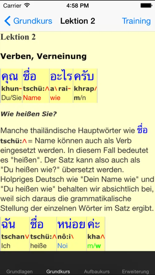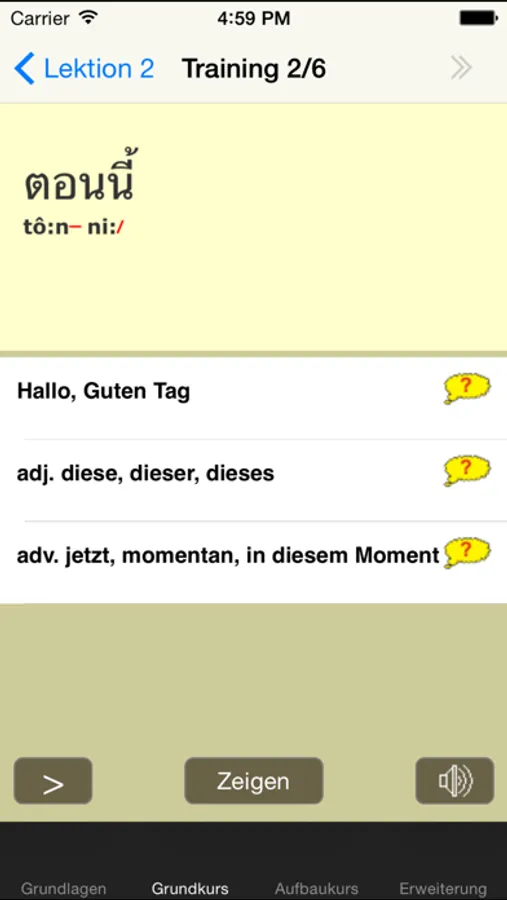 Alle neuen Wörter der Lektionen werden in Thai-Schrift, in Lautschrift und mit deutscher Übersetzung angezeigt. Sie sind außerdem vertont und können beliebig oft vorgesprochen werden. Das ist wichtig, um die genaue Aussprache zu trainieren.