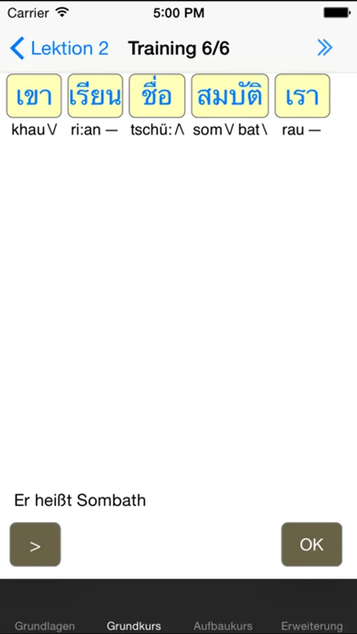 Auch ein Lückentext-Training ist dabei, bei dem zu einem angezeigten deutsch Satz in der Thai-Darstellung ein Wort fehlt, das aus drei Möglichkeiten ausgewählt werden muss.