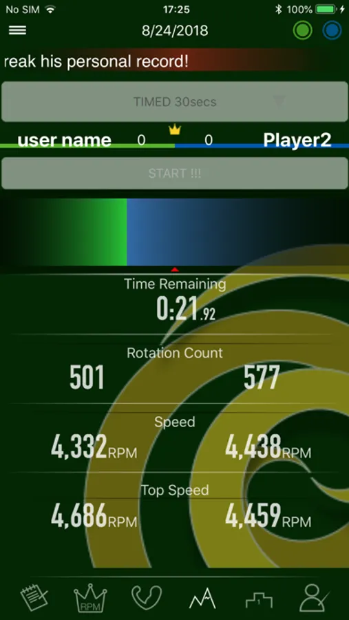 The PowerBall Spinner PB-700BT is an exciting gyroscopic exerciser equipped with a precise battery-free Bluetooth speedometer. Before using: Make sure that Bluetooth is enabled on your device. Launch the NSD Workout app and start your PB-700BT. The rotational movement of the rotor helps to deliver the necessary current for the Bluetooth sensor and it will automatically turn on when rotational speed reaches approximately 3,500 RPM. The onboard LED light will blink intermittently between blue and green to indicate that the counter is ready to pair with the NSD Workout app, and once connected it will return to a static green or blue light when successfully paired. At this point you can use any of the 6 different features within the app.