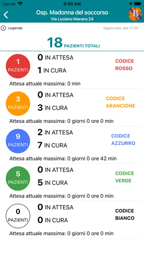 Infine, selezionando uno specifico Pronto Soccorso, verranno dettagliati il numero di pazienti presi in carico, quelli in attesa, il tempo massimo di attesa di un paziente presente e quello di attesa media nelle ultime 24 ore per ogni livello di urgenza.