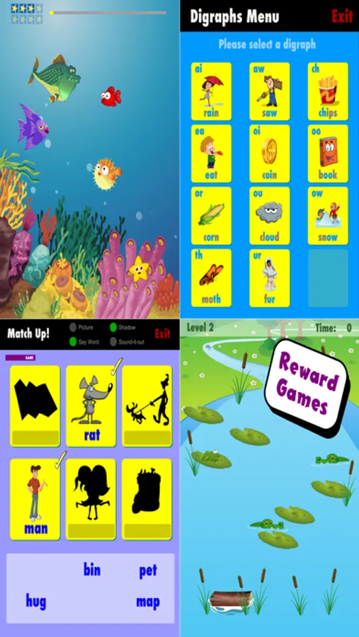 Upon completing each activity, children are rewarded with a simple tap-tap style arcade game of their choice, Frog Hop or Fish Food.