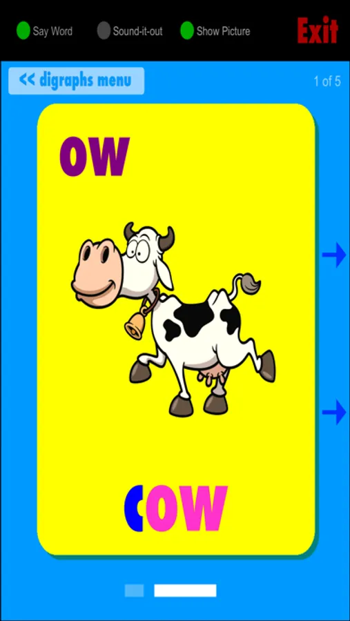Choose a phoneme/sound from the "Digraphs Menu" which includes: ck, sh, ch, th, ng, oo, ee, oa, ou, ai, ea, oi, oy, ow, aw, ir, ar, or, and ur.