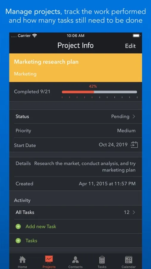 • Reach any project, task, to do list or contact in seconds. Task Office is designed in a way that will allow you to navigate within app screens just in one tap