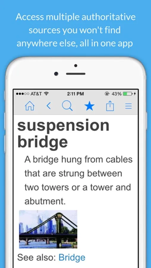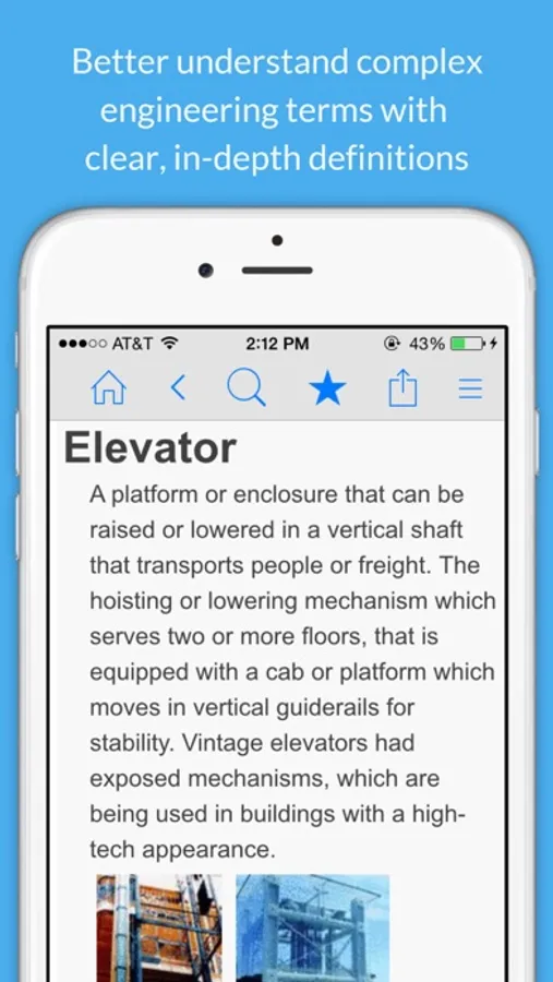 Whether you're an engineer, an engineering student, an architect, or just curious about the field, this free engineering dictionary app can help you find clear, in-depth definitions of engineering terminology right on your iPhone or iPad. Our engineering dictionary app compiles multiple authoritative engineering dictionaries and encyclopedias, all from industry-leading publishers, and features entries from across multiple disciplines, including: