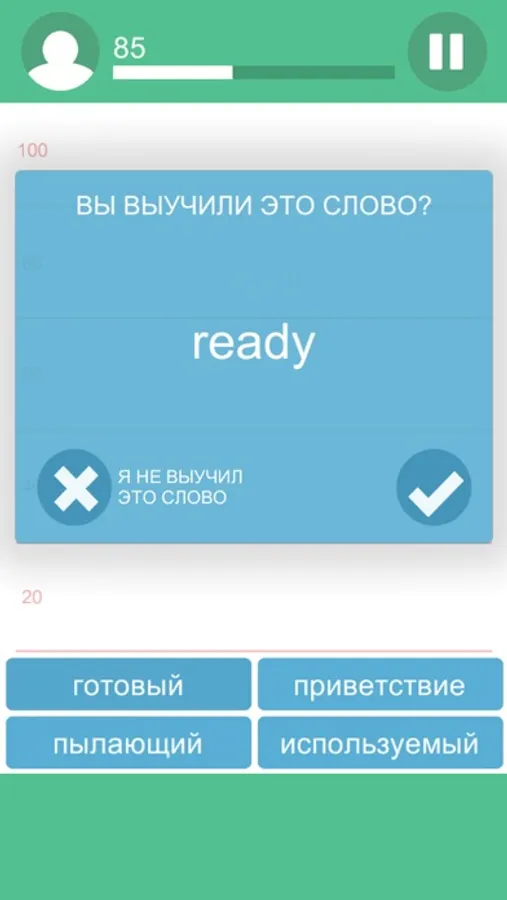 На этапе обучения, вы должны выбирать правильный перевод, для падающего из верхней части экрана слова. Каждое слово - имеет свой счет в баллах, правильный ответ - увеличивает количество балов, а неправильный - сжигает все набранные баллы. Чем выше находится слово в момент ответа, тем больше баллов засчитывается. Как только слово набирает 500 баллов, оно переходит в изученные.