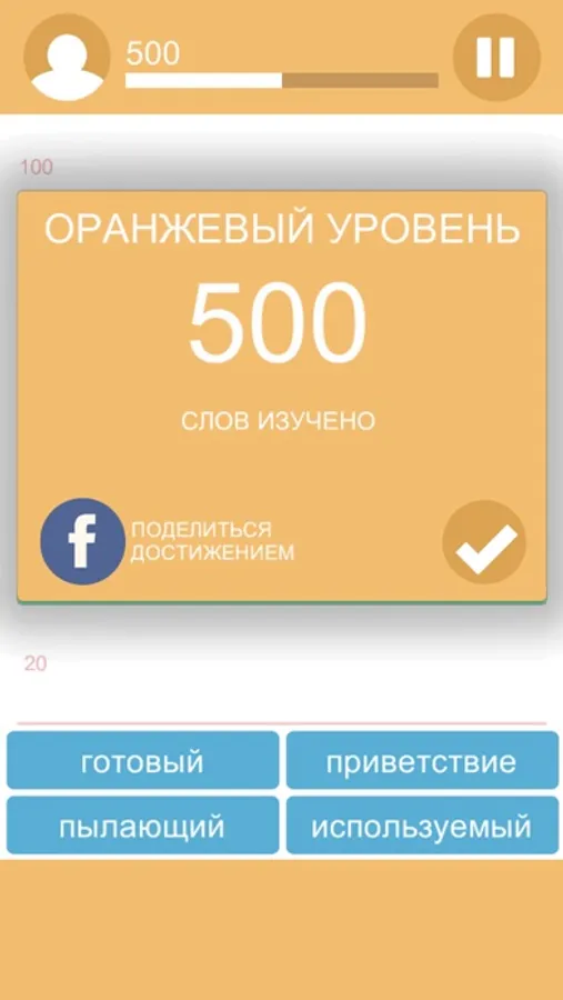 Чтобы подчеркнуть ваши достижения, мы ввели 5 цветовых схем, которые сменяют друг-друга: Зеленый - это нулевой уровень, при достижении 200 слов, вы перейдете на начальный, синий уровень, 500 - базовый оранжевый, 1000 - средний красный и 2500 - комфортный черный. 2500 слов, это достаточный словарный запас для свободного общения на любые темы, а дальнейшее обучение до 6000+ слов, еще больше усилит ваш уровень знаний.