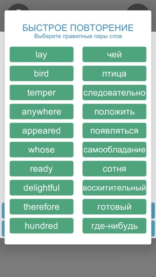 На этапе повторения, открывается таблица с уже изученными словами и их переводом, расположенных в случайном порядке. Вам необходимо выбрать правильные пары слов, чтобы успешно пройти повторение. Если пара будет выбрана неверно, слово вернется обратно на изучение.