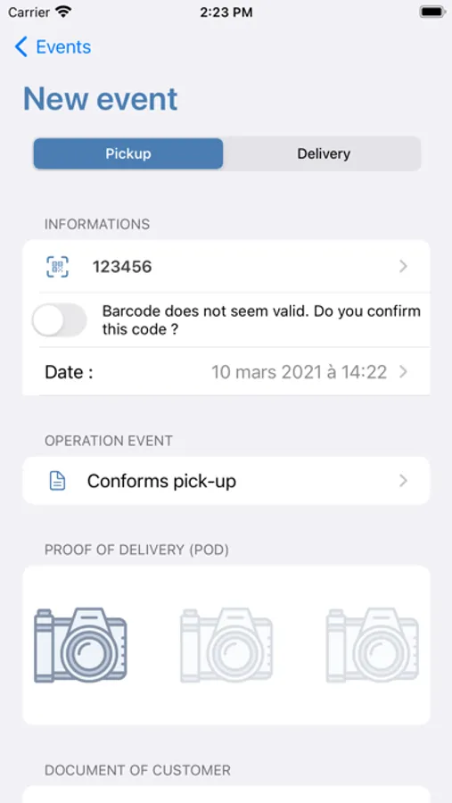 A tool that allows a sub-contracted delivery driver to inform us of the delivery details and to enable him to take a photograph of the bar-code on our delivery note, for the POD