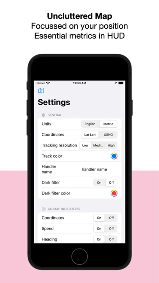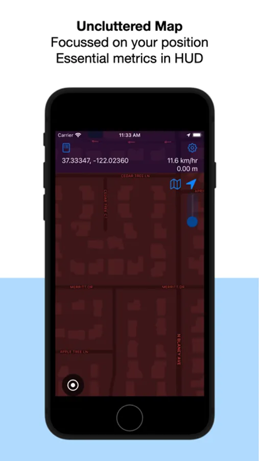 Many display customization options are available to accommodate your specific needs. Location data may be either USGN or decimal latitude, longitude. Length and speed may be set to English or metric. These values may also be shown as a HUD (heads up display) floating over the map. The map can be switched between stylized urban or satellite. Specifically for low light conditions where you need to preserve your night vision, Lokate 3 provides a dark filter you can specify the color of (usually set to red but any color can be chosen to best adapt to your specific eye sight).