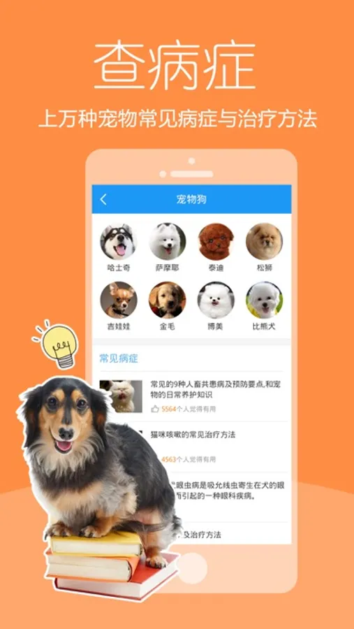 4. 查疾病:狗狗品种大全、猫咪品种大全以及狗狗、猫咪常见疾病与治疗方法大全,还有养狗、养猫相关的饲养、训练、美容、洗澡、剪毛、体检等宠物养护知识,帮助家中宠物健康成长。