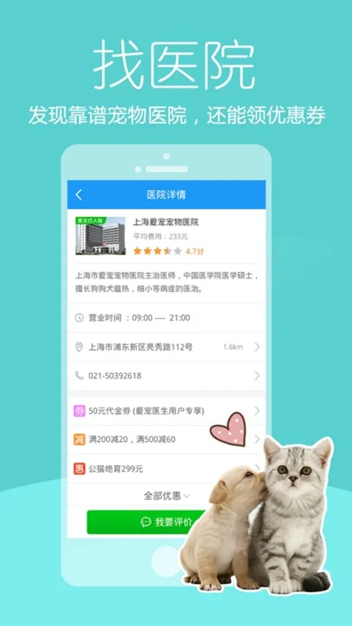 2. 找医院:数万家全国知名宠物医院信息,找到身边最靠谱的宠物医院。