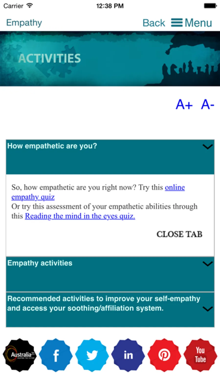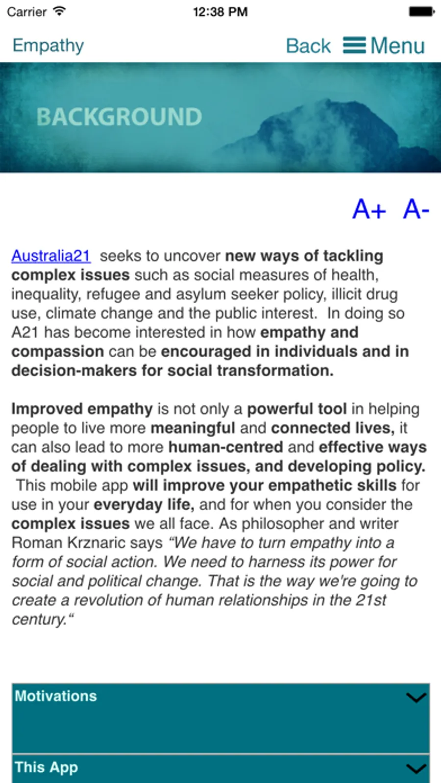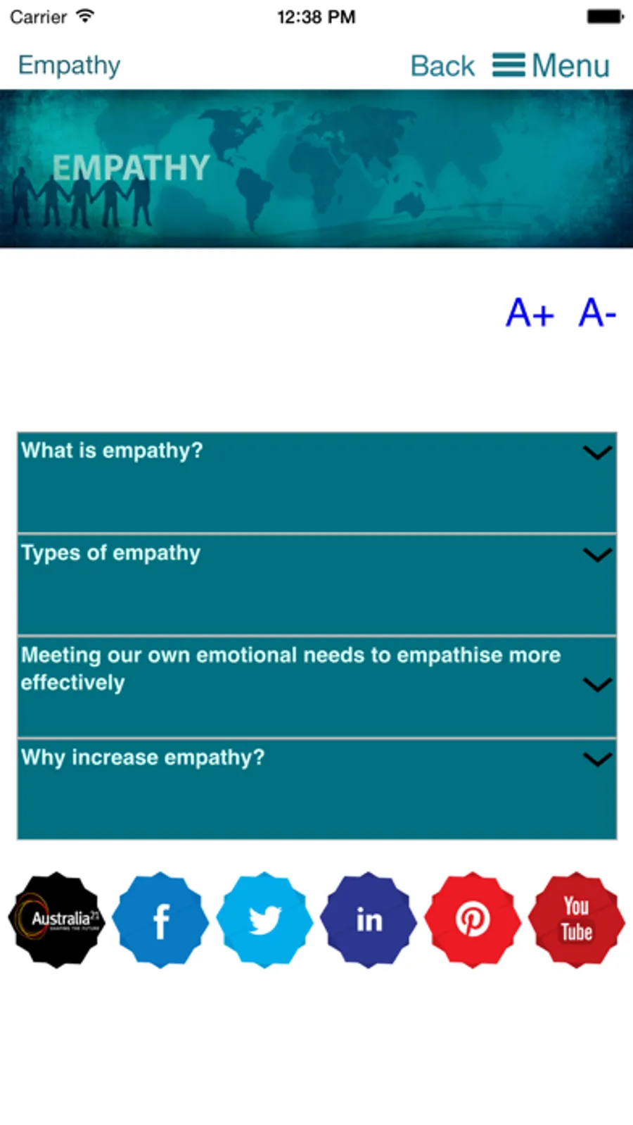 In this app by Australia21 you will be able to learn about empathy and the benefits it can bring to you (and your community), we will give you tips and exercises to help you learn to be more empathic, and you will be given the opportunity to have empathic conversations with other people through our chat room feature.