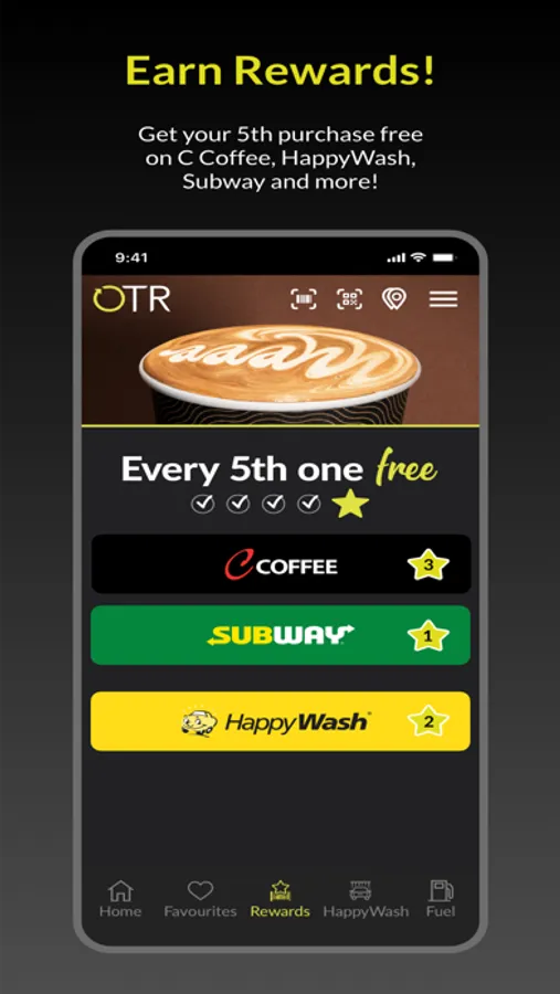 Buy via the OTR App or scan your OTR App barcode instore to get your 5th item FREE on a wide range of products, including C Coffee, HappyWash and more.