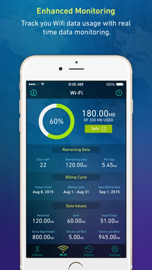 Track your Wifi and Cellular data usage with real time data monitoring, and stop paying excess monthly bills.