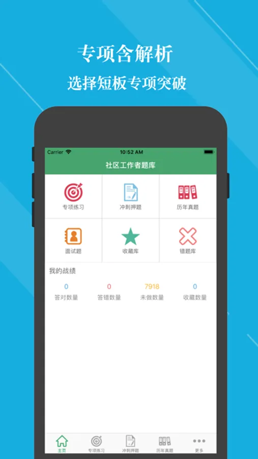 1、专项训练:基础知识单选题、多选题、判断题、公文题、案例分析题,含法律法规、社区基础知识等,每一道题目都有详尽的解析,可选择不同题型,并可手动将易错或未牢固掌握的题加入复习库和错题库,以便反复练习。