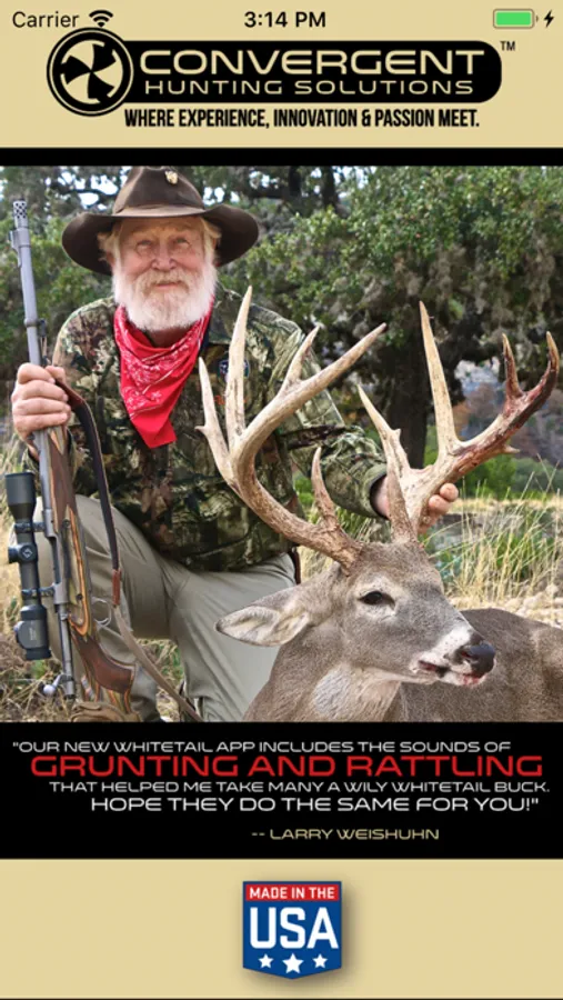 "Our new whitetail app include the sounds of grunting and rattling that helped me take many a wily whitetail buck. Hope they do the same for you!” -- Larry Weishuhn