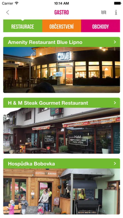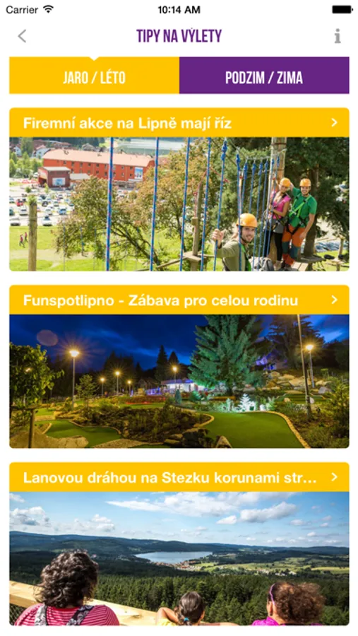 * List of winter and summer attractions with a description and a link to the interactive map.