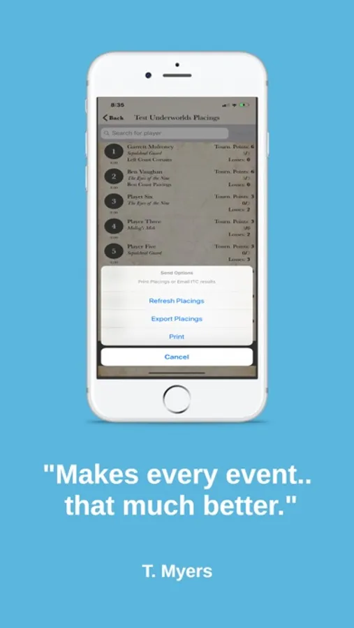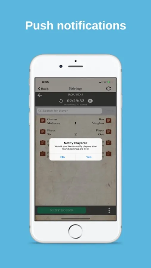 Players’ pairings, results, and placings are posted on the web or in the Best Coast Pairings Player App giving unparalleled visibility. Once you start the event players can view their pairings, find their table and get to playing right away. Push notifications and a built in round timer let attendees know the round is live and the time remaining. When the round is completed players can enter scores via the Player App or the TO App quickly and accurately removing or lessening the need for a dedicated score keeper. When all the scores are in, all the TO has to do is tap to start the next round!