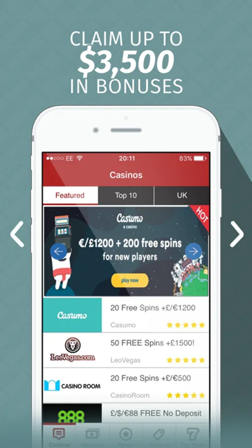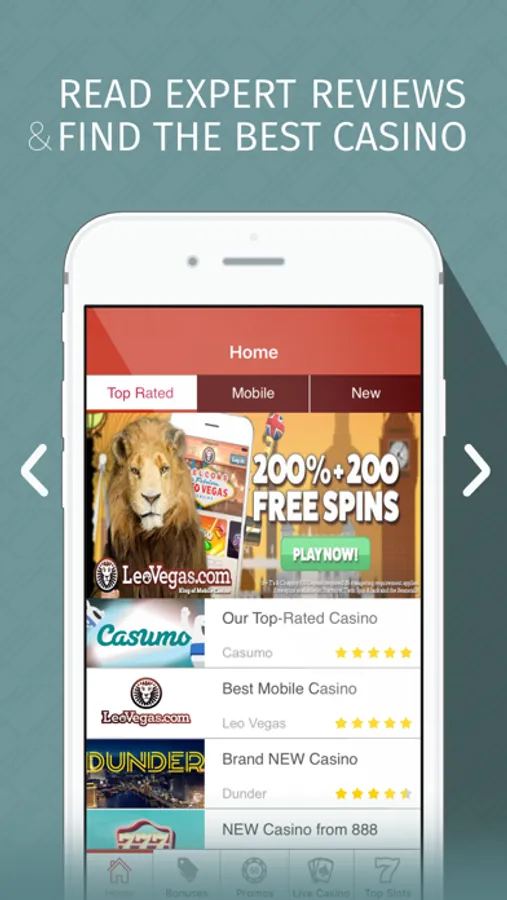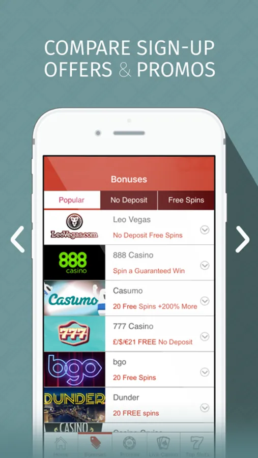 We're here to help you locate the biggest casino bonus offers, the top-rated slots, and best casinos. The app features all the very best free spins offers, no deposit casino bonuses and matched deposit offers available. It is constantly updated with the very best new casinos and latest real money casino offers, so check back regularly to get the best and biggest casino bonuses!