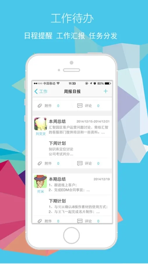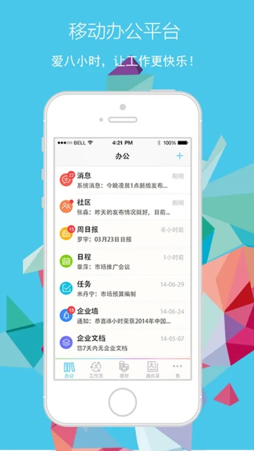 协同办公:有媲美微信的企业即时沟通、可实时查看所有同事的通讯录、团队多人共享日程、企业文档的云端查看、及时汇报工作成果的日志管理、快速跟踪工作进展的任务管理、类似微博的开放式分享、推进企业文化建设的公告。i8小时的协同办公模块可以明显提高企业的协同效率,良好的用户体验减轻了员工的适应成本!