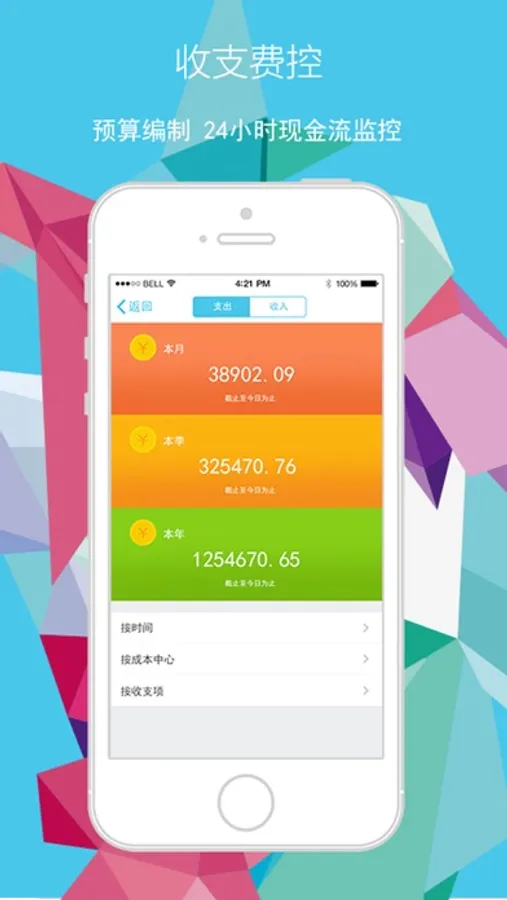 预算费控:手机端实时对比企业的预算与支出情况,自动生成多维度的费控报表,让企业管理者实现对资金收支情况的监督和管控!