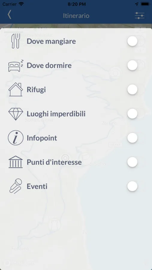 Ogni punto di interesse è geo-localizzato e grazie alla funzione “portami” potrai utilizzare il navigatore e raggiungerlo facilmente. Dal “menu dei servizi” potrai trovare le strutture ricettive, i rifugi, i punti culturali, gli infopoint e gli eventi lungo l’itinerario. Sulla mappa, invece, potrai attivare la funzione “realtà aumentata” per scoprire i punti di interesse più vicini a te e se ti trovi in montagna puoi vedere il nome delle cime che ti circondano.