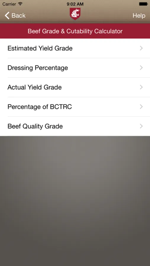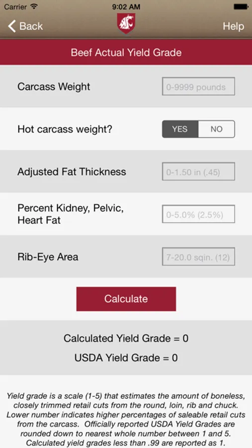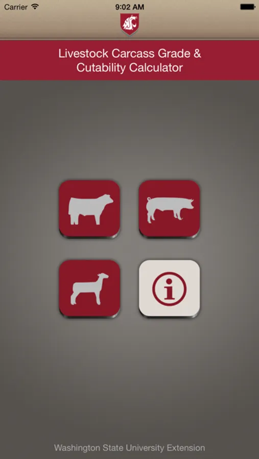 WSU Livestock Carcass Grade & Cutability Calculator is a simple way to calculate carcass yield grade, dressing percentages, and cutability of beef, pork and lamb carcasses. The App can calculate yield grade and cutability from live animal estimates or ultrasound data from cattle, pigs and lambs, and can be used to calculate dressing percentage, yield grade and cutability of beef, pork and lamb carcasses using actual carcass data. Just enter live or carcass data information and the calculator will automatically provide desired information.